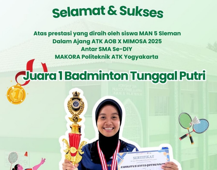 Kemenag Sleman News (MAN 5 Sleman) – Prestasi membanggakan kembali ditorehkan oleh salah satu siswa MAN 5 Sleman. Zahratus Syita Qotrunnadia, siswi kelas XI A, berhasil meraih Juara 1 Badminton Tunggal Putri pada ajang ATK AOB X MIMOSA 2025 Antar SMA se-DIY yang digelar di MAKORA Politeknik ATK Yogyakarta, Kamis (14/8/2025).
