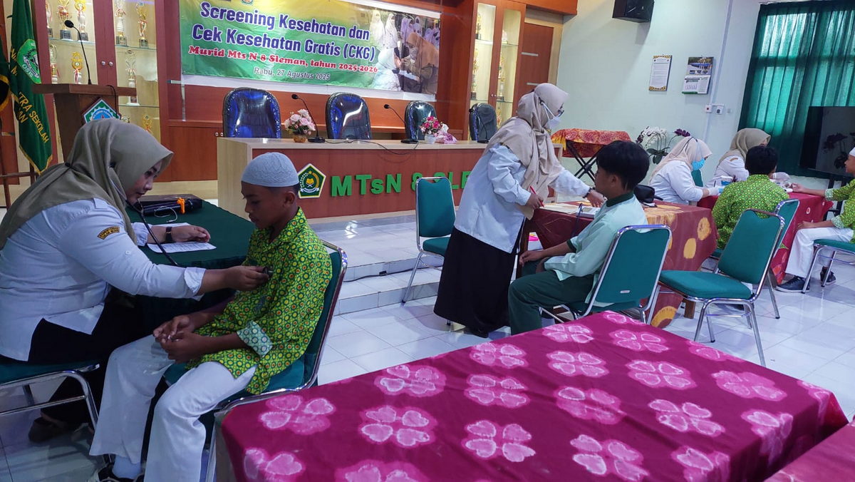 Kemenag Sleman News (MTsN 8 Sleman) — MTsN 8 Sleman bekerja sama dengan Puskesmas Prambanan menyelenggarakan screening kesehatan dan cek kesehatan gratis (CKG) pada Rabu (26/08/2025) di Aula Madrasah. Kegiatan ini diikuti oleh seluruh siswa kelas VII sebagai bagian dari program nasional Kementerian Kesehatan untuk deteksi dini kesehatan anak usia sekolah.