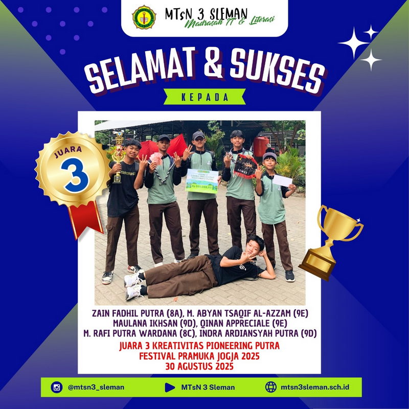 Kemena Sleman News (MTsN 3 Sleman) – Festival Pramuka Jogja 2025 merupakanajang melangkah bersama untuk perubahan, dengan menegaskan peran Pramuka dan generasi muda dalam membangun Indonesia yang berdaya, sehat, dan mandiri secara ekonomi dan sosial.MTsN 3 Sleman turut memeriahkan Festival Pramuka Jogja tahun 2025. Mengirimkan tim Putra untuk mengikuti lomba Kreativitas Pionering yang terdiri dari Zain Fadhil Putra (8A), M. Abyan Tsaqif Al Azzam (9E), Maulana Ikhsan (9D), Qinan Appreciale (9E), M. Rafi Putra Wardana (8C), dan Indra Ardiansyah Putra (9D).