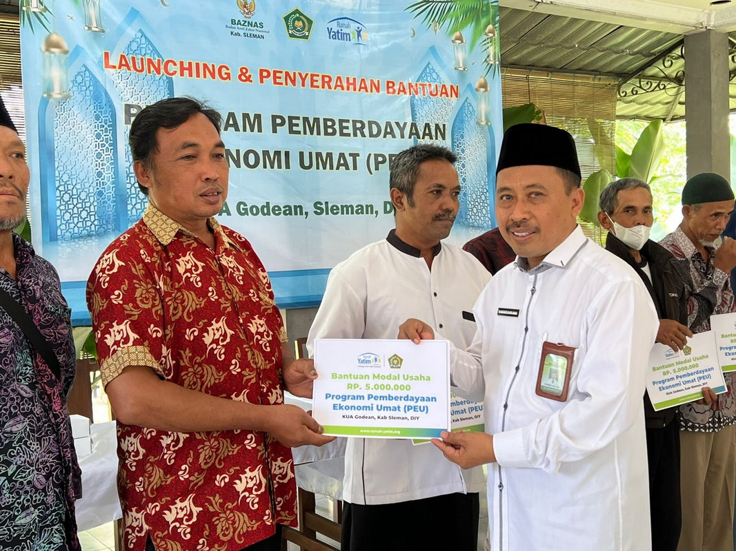 Kemanag Sleman News – Kementerian Agama Kabupaten Sleman bersama Baznas, dan Rumah Yatim meluncurkan sekaligus menyerahkan bantuan Program Pemberdayaan Ekonomi Umat (PEU) Berbasis KUA pada Senin (9/9). Acara ini dihadiri langsung oleh Kepala Kantor Kemenag Sleman, H. Nadhif, S.Ag., M.S.I., Perwakilan Bidang Penerangan Agama Islam, Zakat dan Wakaf Kanwil Kemenag DIY Ujang Sihabudin, Kepala KUA Godean Abdul Rohim, perwakilan Baznas Sleman, LAZ Rumah Yatim, serta para pelaku usaha penerima manfaat.