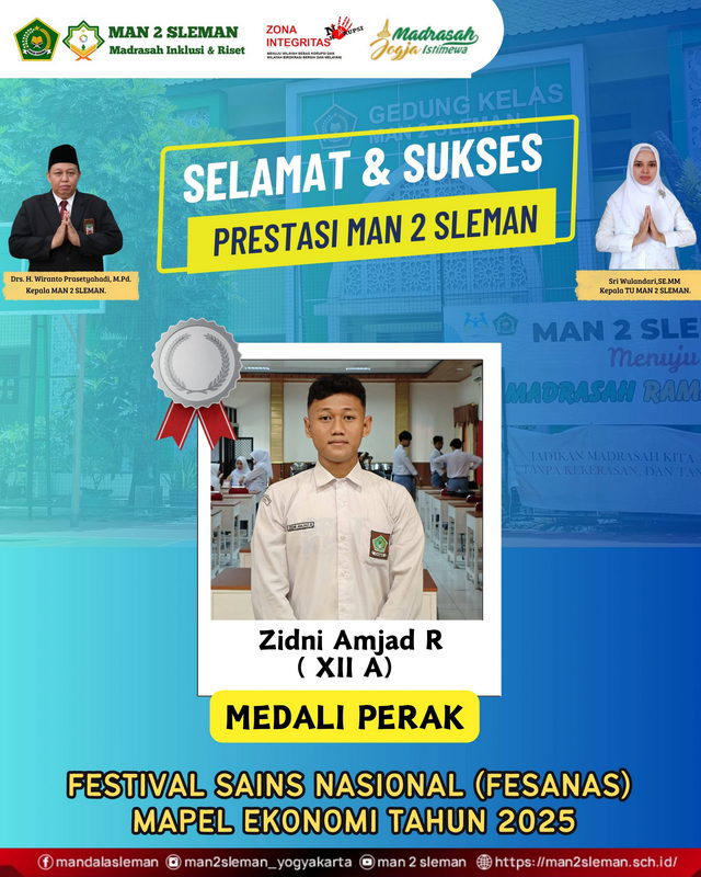 Kemenag Sleman News (MAN 2 Sleman) – Sebuah pencapaian gemilang kembali diraih oleh salah satu siswa MAN 2 Sleman. Medali perak berhasil diraih oleh Zidni Amjad Kelas XII A dalam ajang Festival Sains Nasional (FESANAS) Mapel Ekonomi Jenjang SMA/MA. Festival Sains Naosional (FESANAS) ini diselenggarakan oleh Fosnas pada tanggal (7/9/2025) secara online.