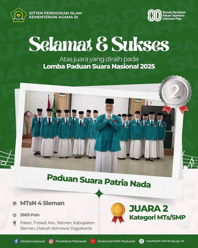 Berdasarkan Keputusan Direktur Jenderal Pendidikan Islam Nomor 7311 Tahun 2025 tentang Penetapan Pemenang Lomba Paduan Suara Tahun Anggaran 2025, paduan suara MTsN 4 Sleman yang tergabung dalam kelompok Patria Nada berhasil meraih juara 2 dengan skor 3669. Pengumuman hasil lomba disampaikan pada Kamis (11/9/2025). Prestasi ini menjadi bukti bahwa semangat dan kerja keras siswa MTsN 4 Sleman mampu bersaing di tingkat nasional.