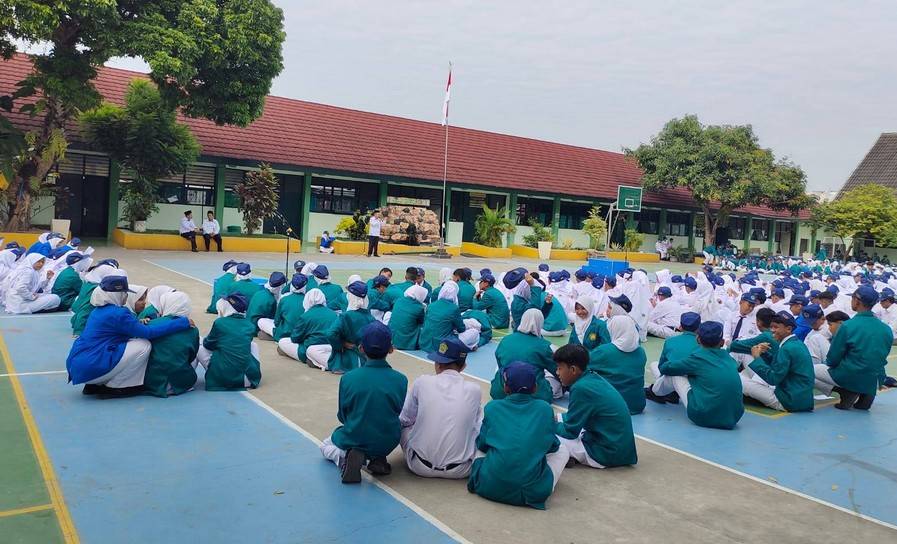 Kemenag Sleman News (MTs Negeri 3 Sleman) – Pengarahan penerimaan Makan Bergizi Gratis MTs Negeri 3 Sleman digelar pada Senin (8/9/2025) di lapangan upacara pukul 07.25 WIB. Haji Masruri, S.Pd.I. selaku wakil kepala madrasah bidang sarana prasarana sekaligus penanggung jawab MBG menjelaskan kepada seluruh murid kelas VII, VIII, IX MTs Negeri 3 Sleman dengan teliti dan runtut segala teknik pelaksanaan pembagian dan distribusi ke kelas-kelas. Masruri memastikan agar anak-anak tertib menerima distribusi Makan Bergizi Gratis yang dibagikan oleh guru piket dibantu keamanan madrasah dan ketua kelas. βAlhamdulillah kita syukuri akhirnya MBG benar-benar sampai ke tangan kita hari pertama ini, jangan sampai berebut dan ada yang tidak kebagian,β terangnya semangat.