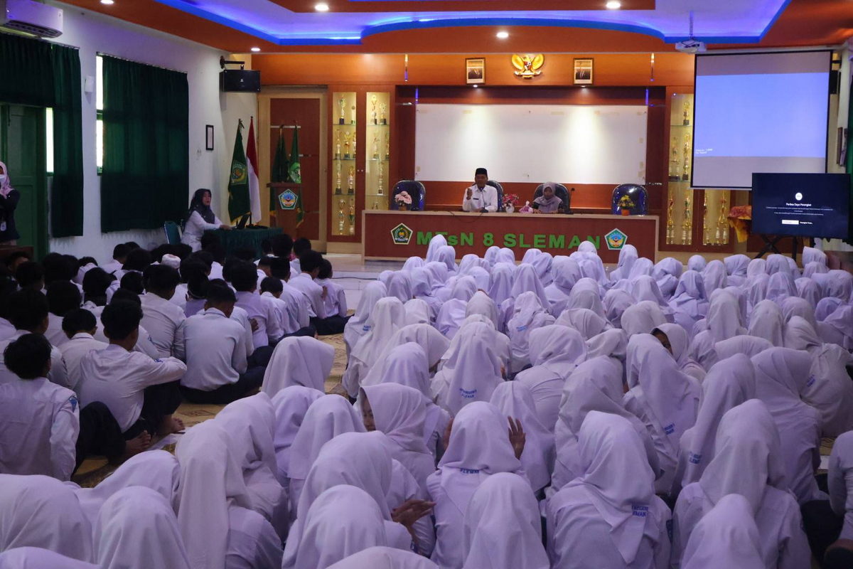 Kemenag Sleman News – (MTsN 8 Sleman) Aula MTsN 8 Sleman pada Selasa (16/9/2025) menjadi saksi pelaksanaan kegiatan sosialisasi Pemilu yang digelar oleh Komisi Pemilihan Umum (KPU) Kabupaten Sleman. Kegiatan ini diikuti dengan antusias oleh para siswa sebagai bagian dari pendidikan demokrasi sejak dini. Dalam kesempatan tersebut, Kepala MTsN 8 Sleman, Agus Sholeh, S.Ag., hadir memberikan sambutan sekaligus membuka secara resmi kegiatan sosialisasi tersebut.