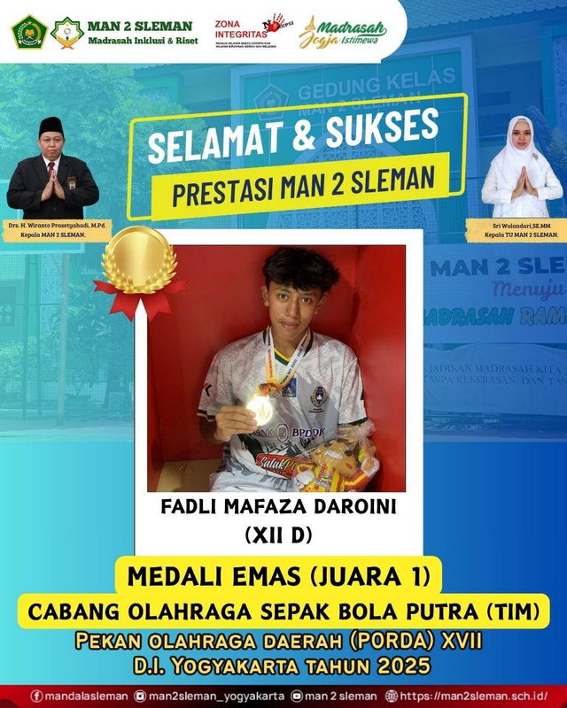 Kemenag Sleman News (MAN 2 Sleman) — Prestasi membanggakan kembali ditorehkan atlet MAN 2 Sleman dalam ajang Pekan Olahraga Daerah (PORDA) tingkat Provinsi DIY tahun 2025. Fadli Mafaza (XII D) siswa MAN 2 Sleman merupakan salah satu punggawa tim sepak bola Kabupaten Sleman yang berhasil meraih medali emas dalam ajang Pekan Olahraga Daerah (PORDA) tingkat Provinsi DIY ke XVII tahun 2025.