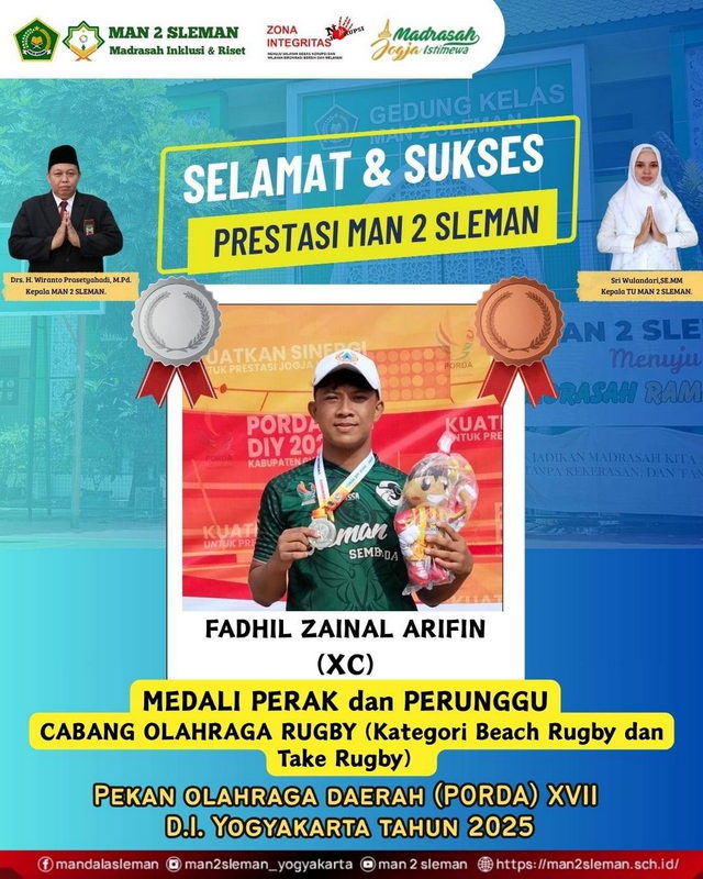 Kemenag Sleman News (MAN 2 Sleman ) – Jelang penutupan PORDA DIY XVII Atlet MAN 2 Sleman terus meraih prestasi. Kali ini datang dari Cabang Olahraga Rugby. Fadhil Zainal Arifin siswa kelas X C MAN 2 Sleman merupakan salah satu punggawa tim Rugby Kabupaten Sleman berhasil membawa pulang medali perak dan perunggu Cabor Rugby kategori beach rugby dan tag rugby. Prestasi membanggakan ini tentunya buah dari hasil kerja keras atlet.