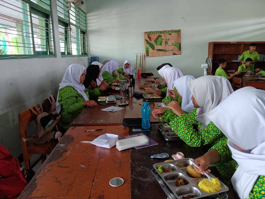 Para siswa menyantap MBG dengan lahap hingga ompreng tampak bersih. Kegiatan makan berlangsung di ruang kelas masing-masing, dan didampingi guru bidang studi yang sedang mengajar pada jam pelajaran ke-4. Menu yang disajikan pun setiap hari bervariasi sehingga diharapkan dapat membuat para siswa selalu bersemangat menghabiskan menu MBG.