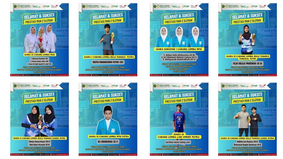 Dalam ajang PKM tingkat Kabupaten Sleman tahun 2025, siswa-siswi MAN 2 Sleman berhasil meraih sejumlah prestasi membanggakan. Berikut daftar perolehan juara:
