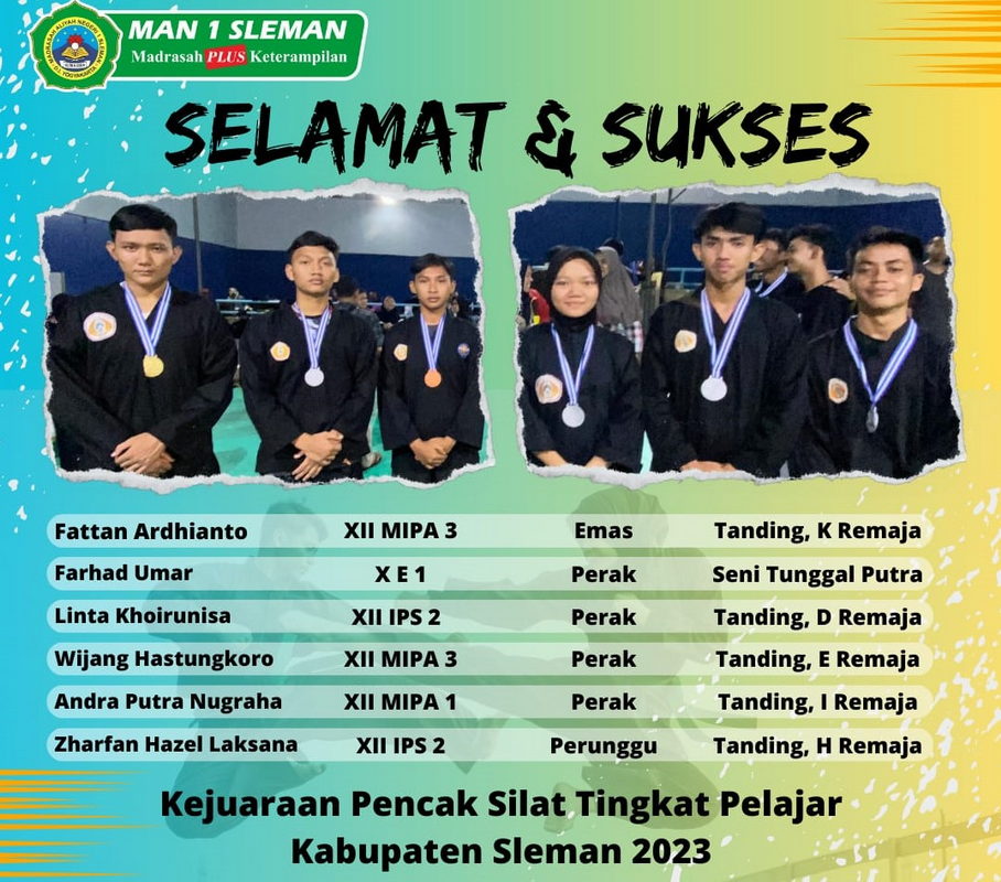 Sleman (MAN 1 Sleman)— Sebanyak 6 pesilat MAN 1 Sleman meraih 6 medali pada Kejuaraan Kabupaten (Kejurkab) Pencak Silat Pelajar Kabupaten Sleman Tahun 2023 yang digelar Senin – Kamis , 20 – 23 November 2023 di GOR BPMP DIY Kalasan, Sleman.