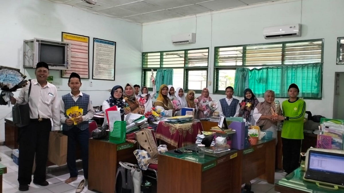 Sleman (MTsN 9 Sleman).- Ada banyak cara yang dilakukan oleh masyarakat Indonesia memperingati Hari Guru Nasional (HGN) baik secara online maupun offline. Beberapa cara yang dilakukan antara lain mengirimkan ucapan terima kasih kepada guru via WhatsApp, memberikan hadiah atau penghargaan kepada guru, mengikuti acara peringatan Hari Guru Nasional yang diselenggarakan oleh instansi pendidikan, dan lain sebagainya. Fenomena inilah yang kemudian menginspirasi Pengurus OSIS MTs Negeri 9 Sleman (PEROSMA) mengadakan kegiatan bagi-bagi kado cantik untuk semua guru di MTs Negeri 9 Sleman. Seluruh anggota OSIS bergerak menuju ruang guru untuk membagikan buket bunga dan makanan ringan pada Selasa (28/11/2023).