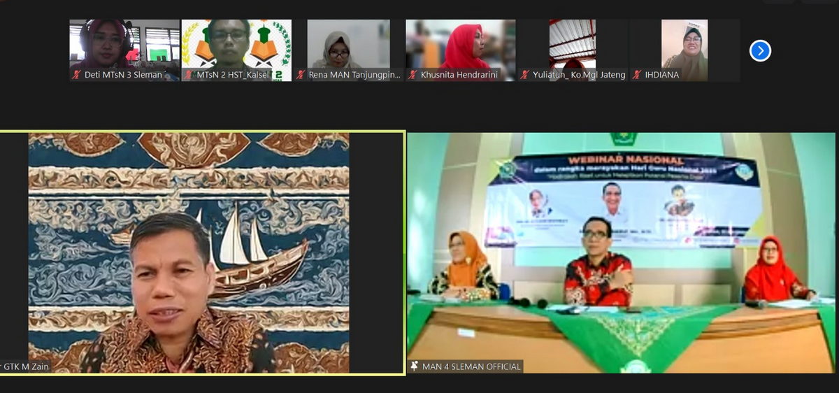 Hal tersebut diungkapkan Direktur GTK Madrasah Kemenag RI Dr.Muhammad Zain, M.Ag saat membuka Webinar Nasional dalam rangka merayakan Hari Guru Nasional 2023, yang diselenggarakan oleh MAN 4 Sleman Yogyakarta, Kamis(30/11/2023) siang.