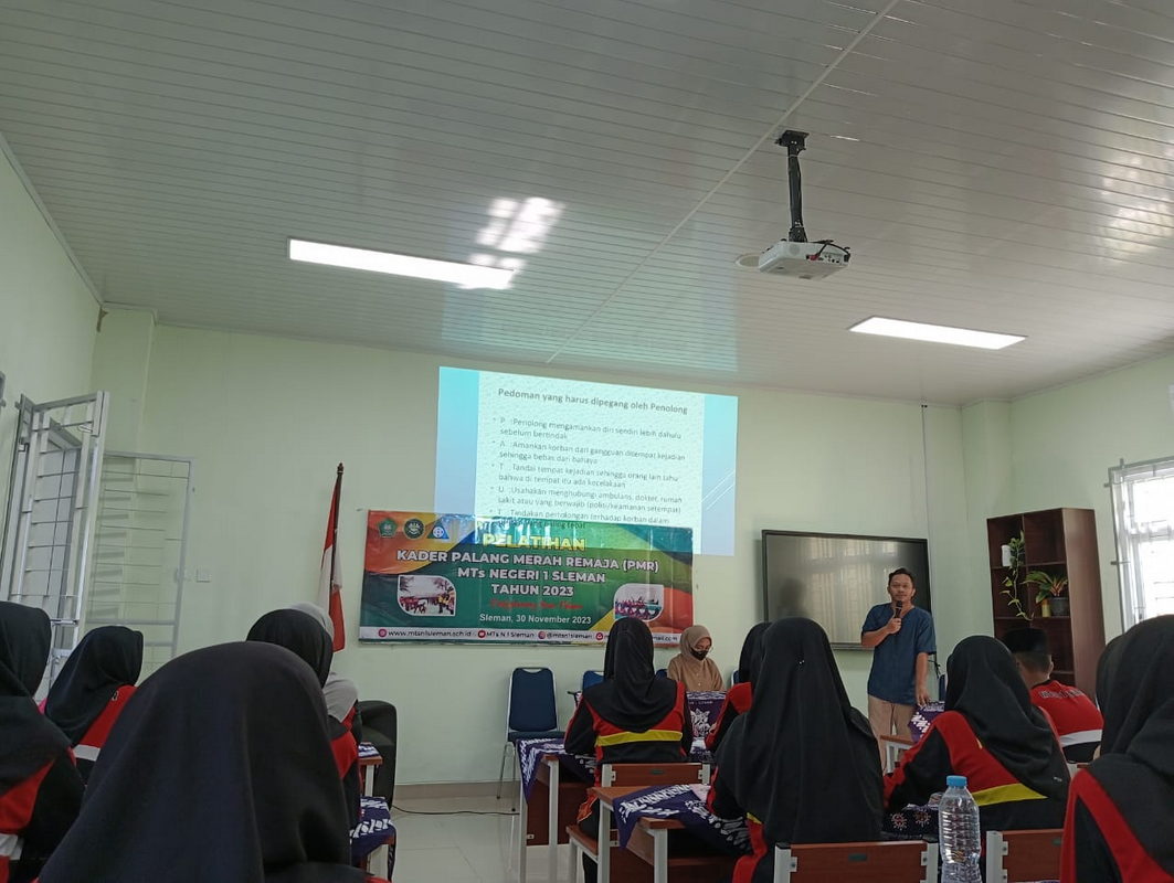 Sleman (MTsN 1 Sleman) – Unit Kesehatan Sekolah (UKS) MTsN 1 Sleman pada Selasa (12/12/2023) menyelenggarakan Pelatihan Kader PMR (Palang Merah Remaja) bertempat di Ruang Digital MTsN 1 Sleman. Kegiatan ini dilaksanakan pukul 07.00 wib – 13.00 wib dan diikuti oleh perwakilan siswa kelas VII dan VIII, berjumlah 24 siswa. Materi kegiatan pelatihan ini meliputi pelatihan P3K (Pertolongan Pertama Pada Kecelakaan) dan pelatihan P3P (Pertolongan Pertama Pada Penyakit), dengan narasumber dari Puskesmas Seyegan, dr.Rr.Ajeng Widyastuti dan Sunu Ardi Widayat, A.Md,Kep.
