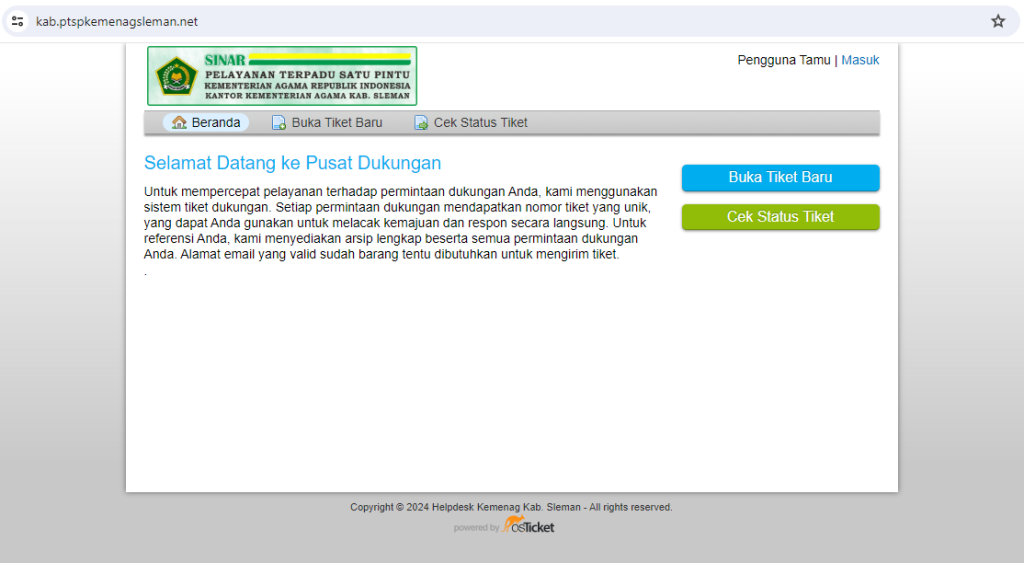 “PTSP” adalah akronim dari Pelayanan Terpadu Satu Pintu yang merupakan sebuah sistem / aplikasi layanan masyarakat berbasis tiket yang dikembangkan oleh Kantor Kementerian Agama Kabupaten Sleman dalam rangka mendukung salah satu program prioritas Kementerian Agama yaitu program Digitalisasi Layanan. Aplikasi “PTSP” adalah aplikasi online (awalnya berupa aplikasi web secara lokal namun sejak 2020 sudah kami kembangkan menjadi full online), sehingga seluruh masyarakat maupun stakeholder lintas instansi dapat mengakses sistem layanan yang ada di aplikasi ini kapan saja dan di mana saja serta menggunakan perangkat apa saja selama terkoneksi dengan jaringan internet. Penggunan layanan PTSP kami selain secara online, juga masih kami layani secara offline (datang langsung ke ruang PTSP).